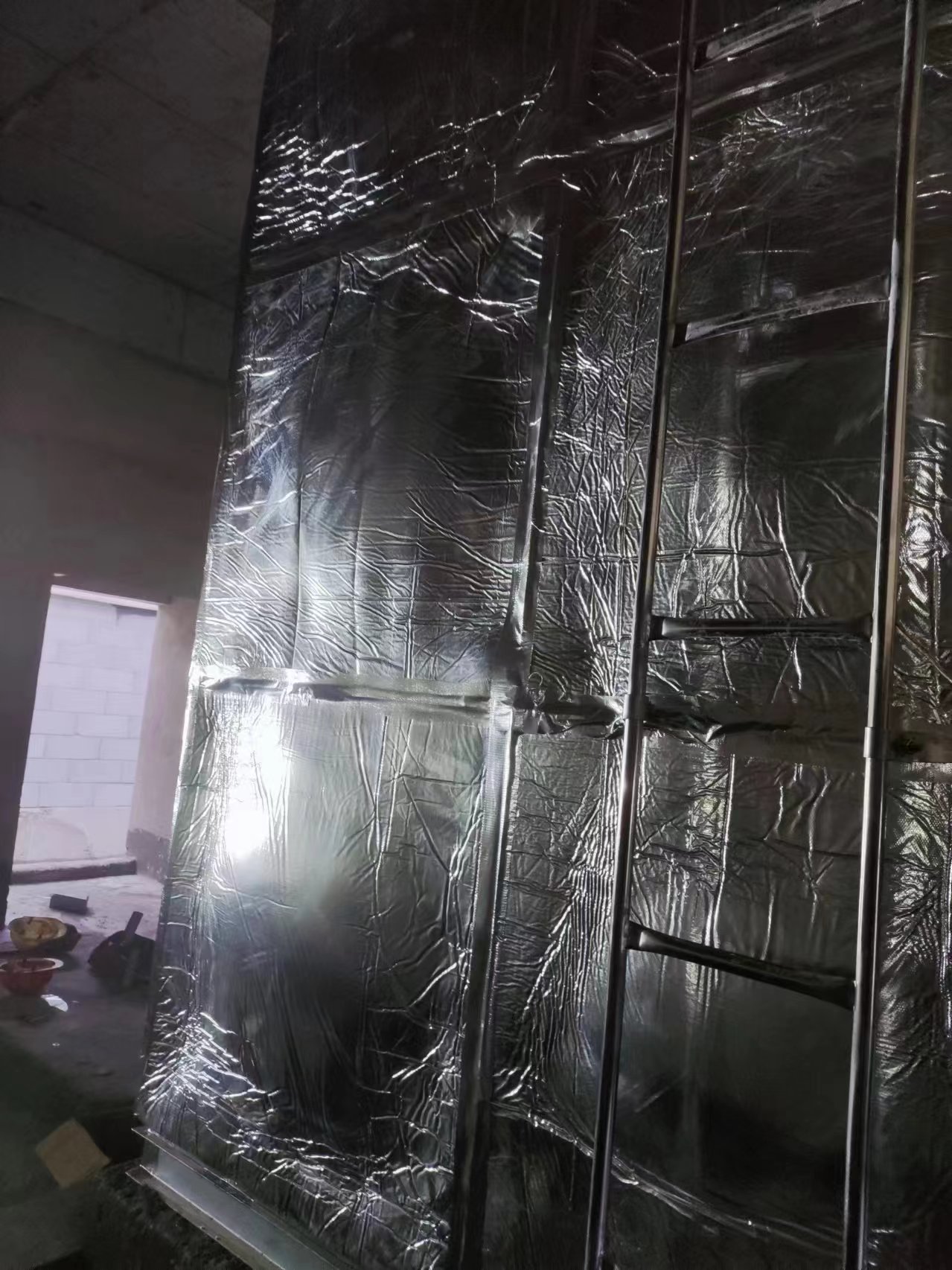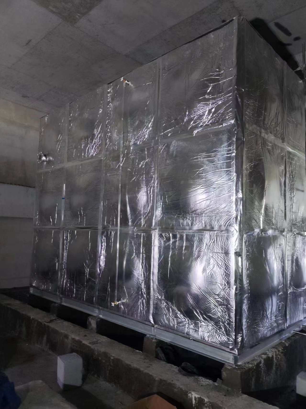 我司承接的山西省大同市中建三局職業(yè)技術學院辦公樓屋頂高位消防水箱項目,已經安裝試水完成。此水箱為高位鍍鋅鋼板消防水箱,外表做了橡塑鋁箔布保溫層,鋁箔橡塑保溫材料為閉泡式結構,且表面平整光滑,所以外界空氣中的水汽很難滲透到材料之中,保冷保溫不必再添加隔汽層,從而獲得較佳的導熱系數,它的陰濕因子大于4.5×103,使它的整體既是保溫層又是防潮層。因此適用于多種防火要求較高的場所使用。