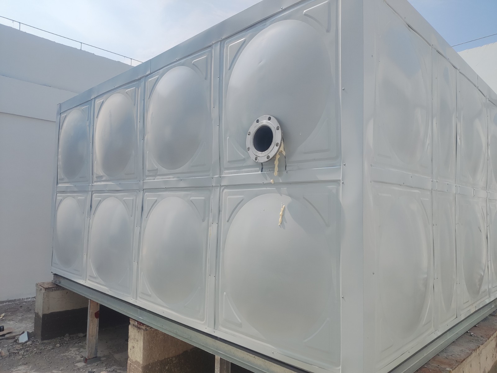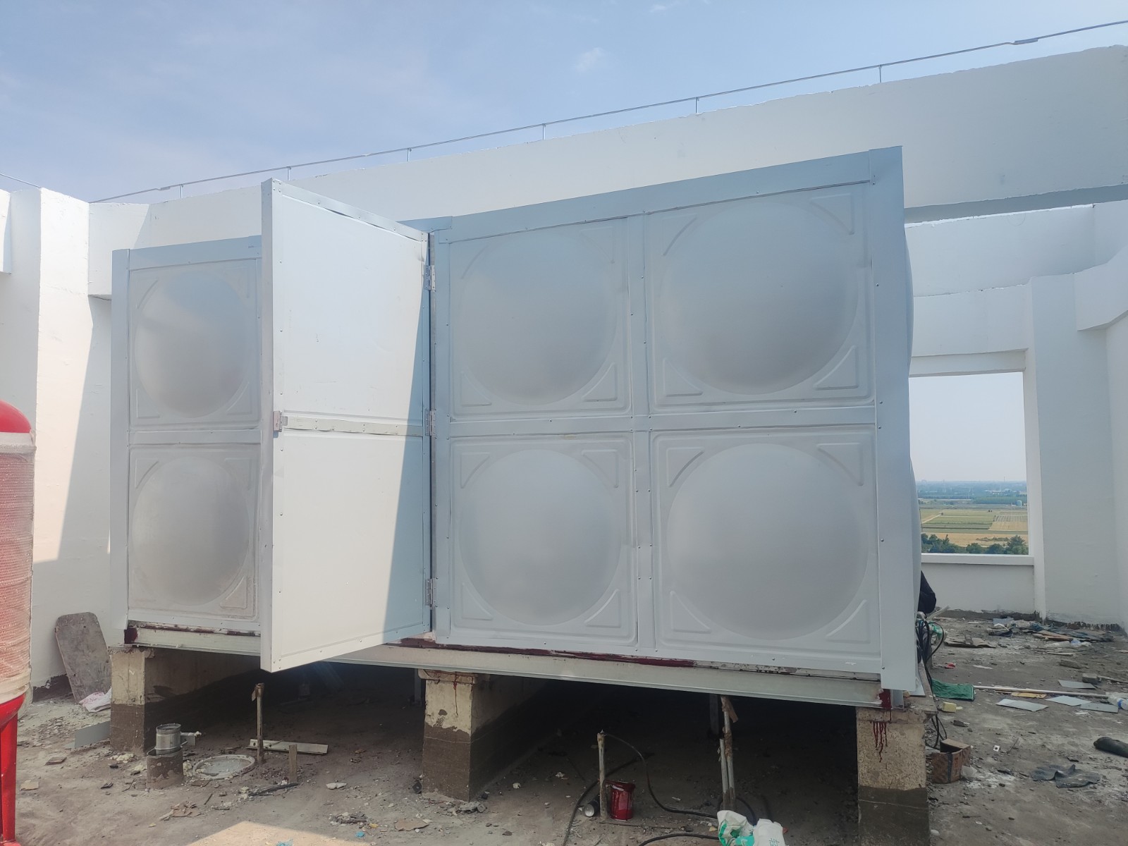 我司承接的河北省滄州市蕭寧縣不銹鋼消防箱泵一體水箱已完工。此水箱為消防箱泵一體水箱,外層增加了聚氨酯保溫層,具有質量輕、導熱系數低、耐熱性好、耐老化、容易與其它基材黏結、燃燒不產生熔滴等優異性能,是目前性能較好的保溫材料。